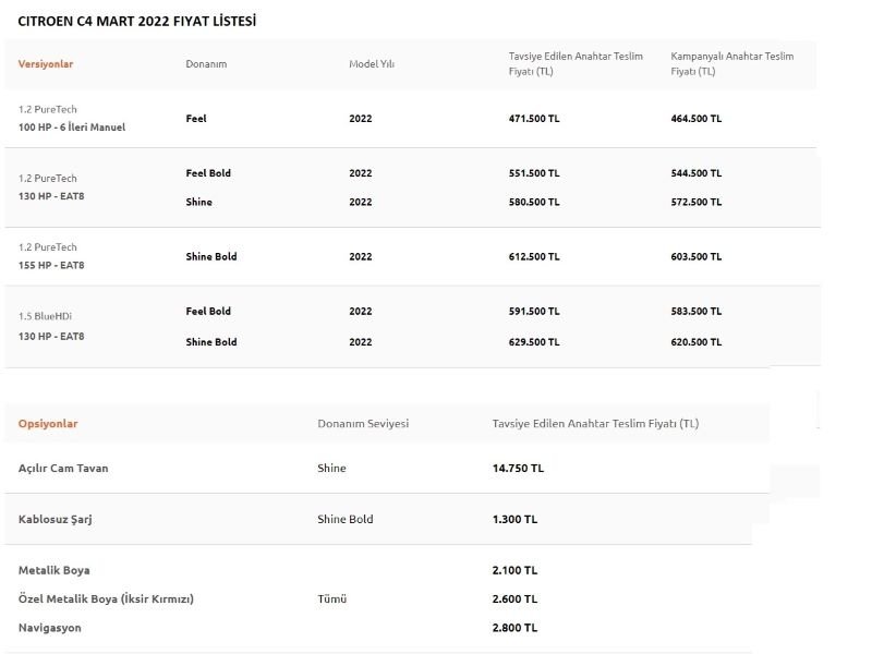 Citroen'in kompakt sınıfta bulunan C4 modeli, 1,5 litrelik 130 HP gücünde dizel ve 100 HP, 130 HP ve 155 HP güç seçenekleri sunan 1,2 litrelik benzinli motor seçeneğiyle satılıyor.Feel, Feel Bold, Shine ve Shine Bold olarak 4 farklı donanım seçeneği olan bu aracın fiyatı 464.500 TL ile 620.000 TL arasında değişiyor.