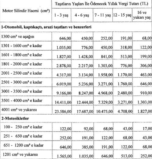 İşte 2017 yılında araç tiplerine göre tüm yaş ve silindir hacmi kategorilerindeki araçlardan alınacak motorlu taşıt vergisi tutarları :